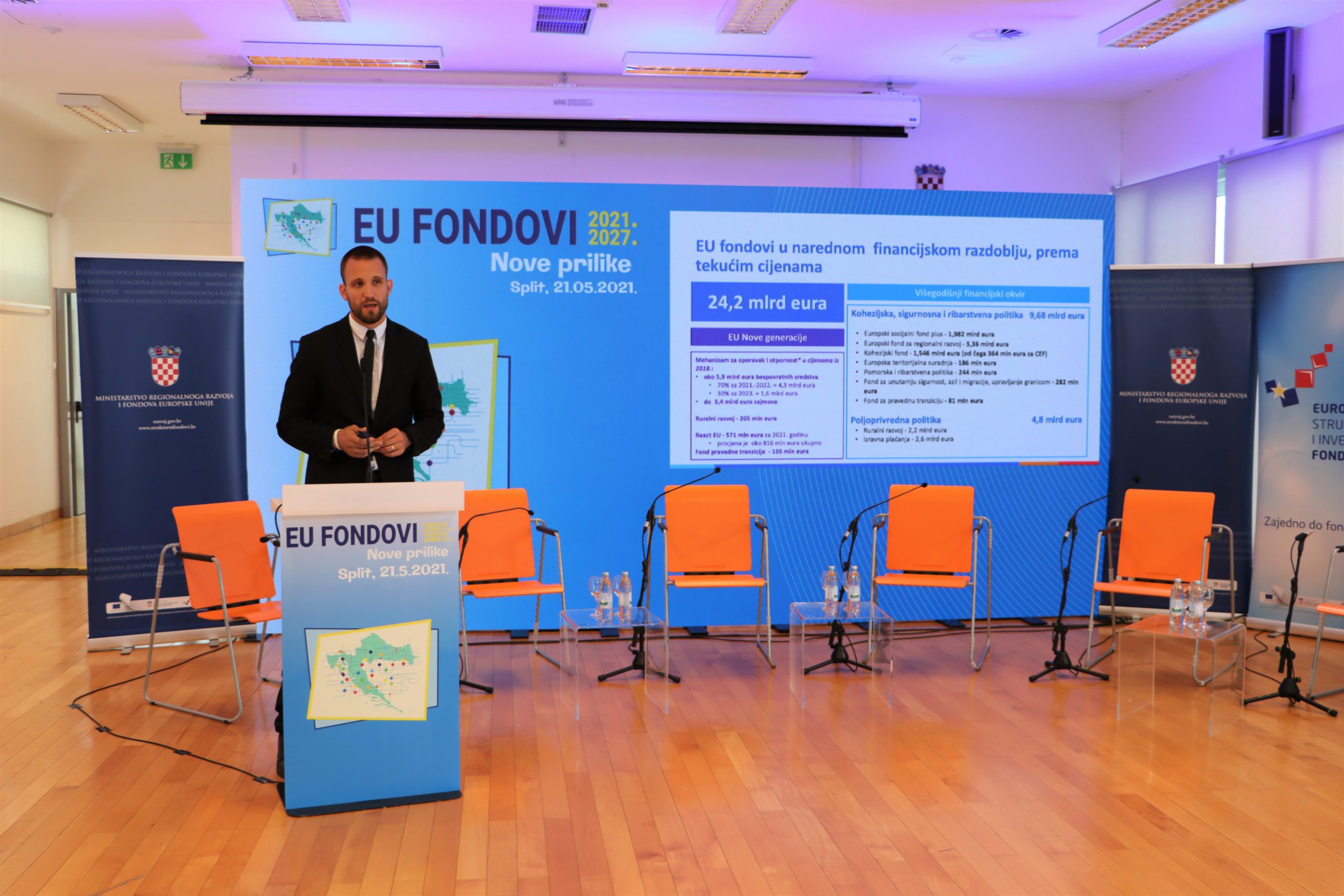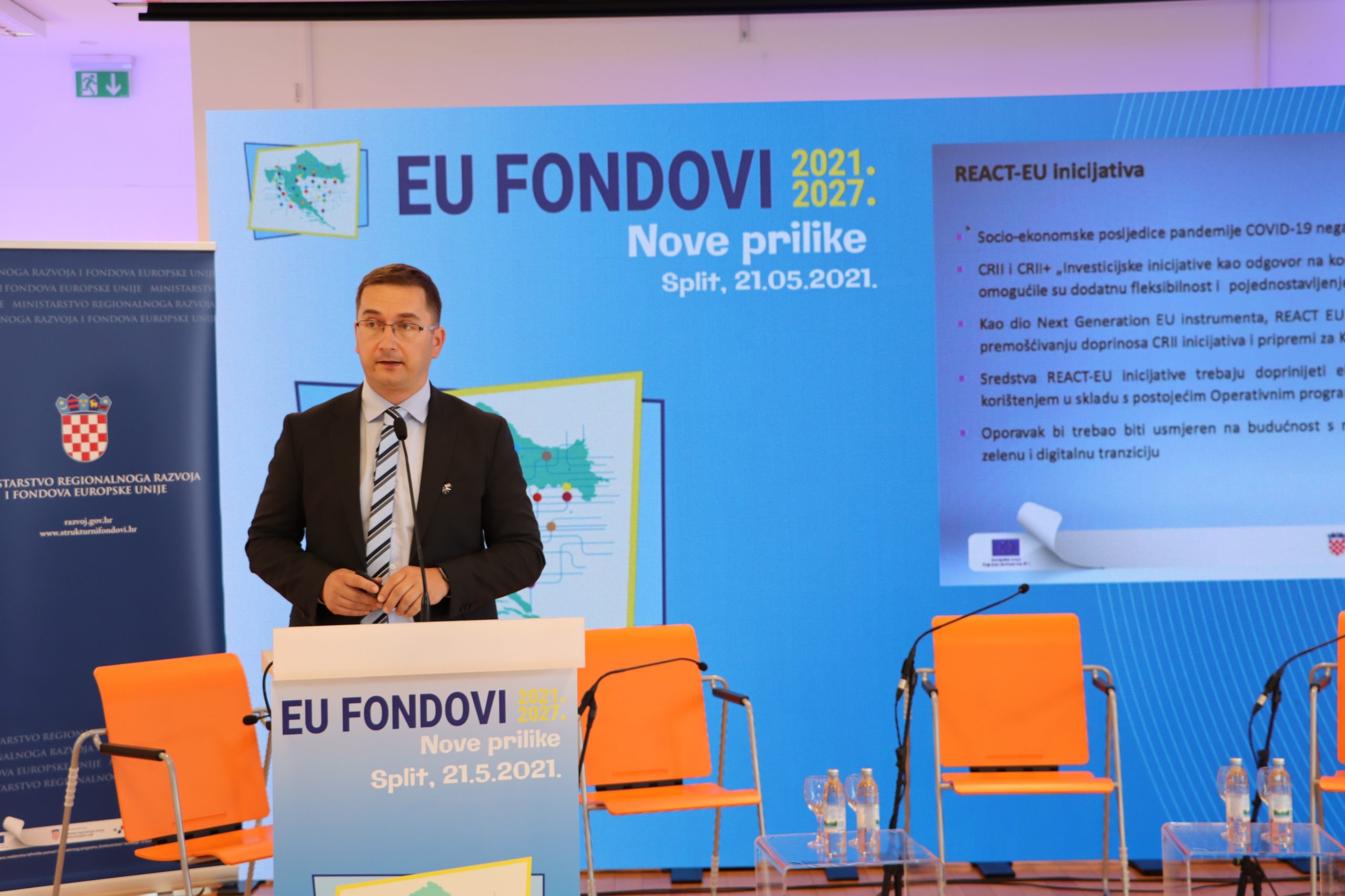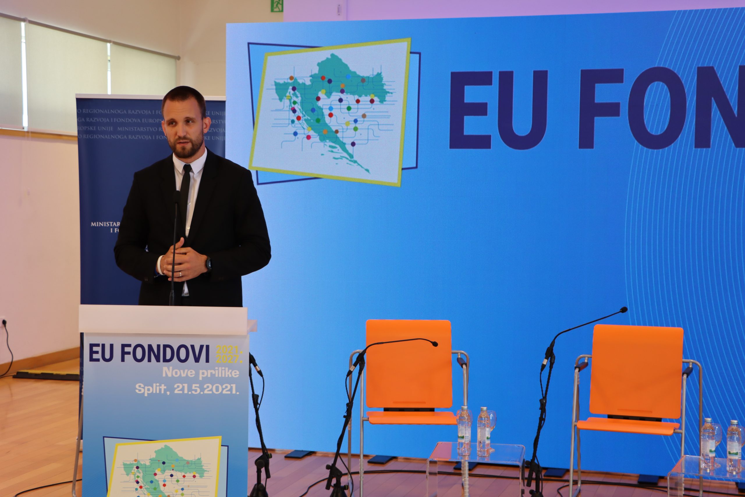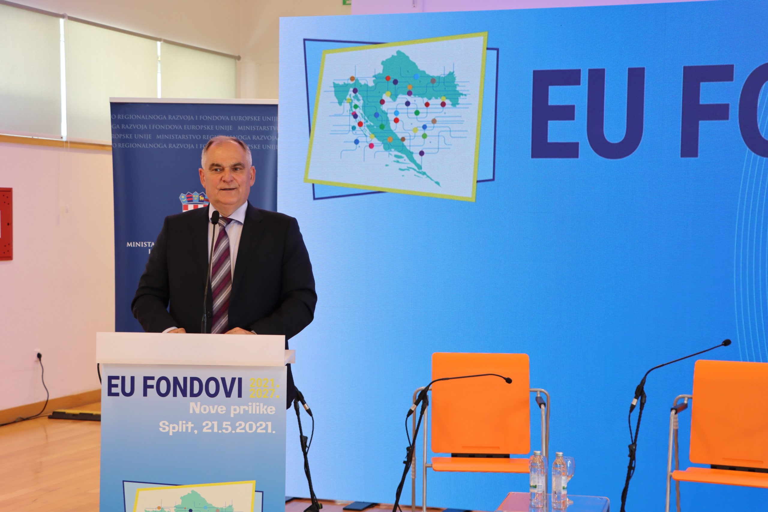 Državni tajnik Ministarstva regionalnoga razvoja i fondova Europske unije Šime Erlić u uvodnom se govoru također osvrnuo na korištenje EU fondova na području grada Splita i Splitsko-dalmatinske županije. „U ovom formatu obilazimo sve gradove u Hrvatskoj kako bismo svim zainteresiranima omogućili pripremu za novo financijsko razdoblje. Idealan je trenutak za predstavljanje novih mogućnosti u novom razdoblju koje je pred nama jer se završio Nacionalni plan oporavka i otpornosti, koji je prošao je Saborsku proceduru te je predan Europskoj komisiji, a pri samome kraju je i proces izrade novih Operativnih programa 2021-2027“.