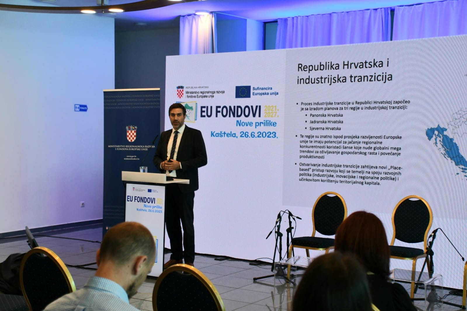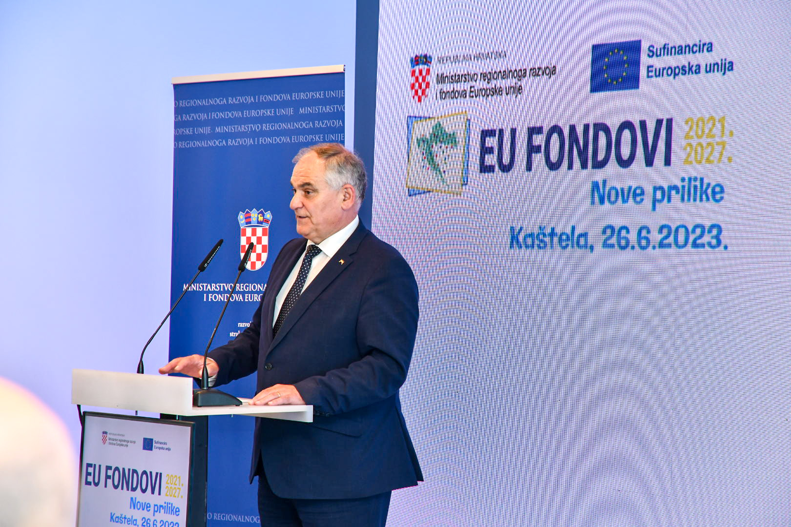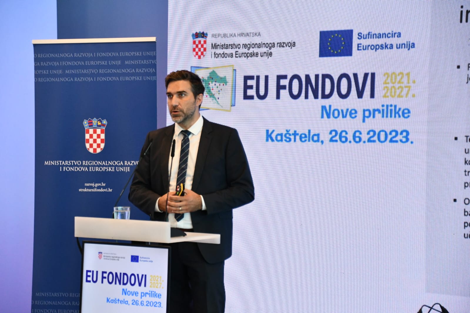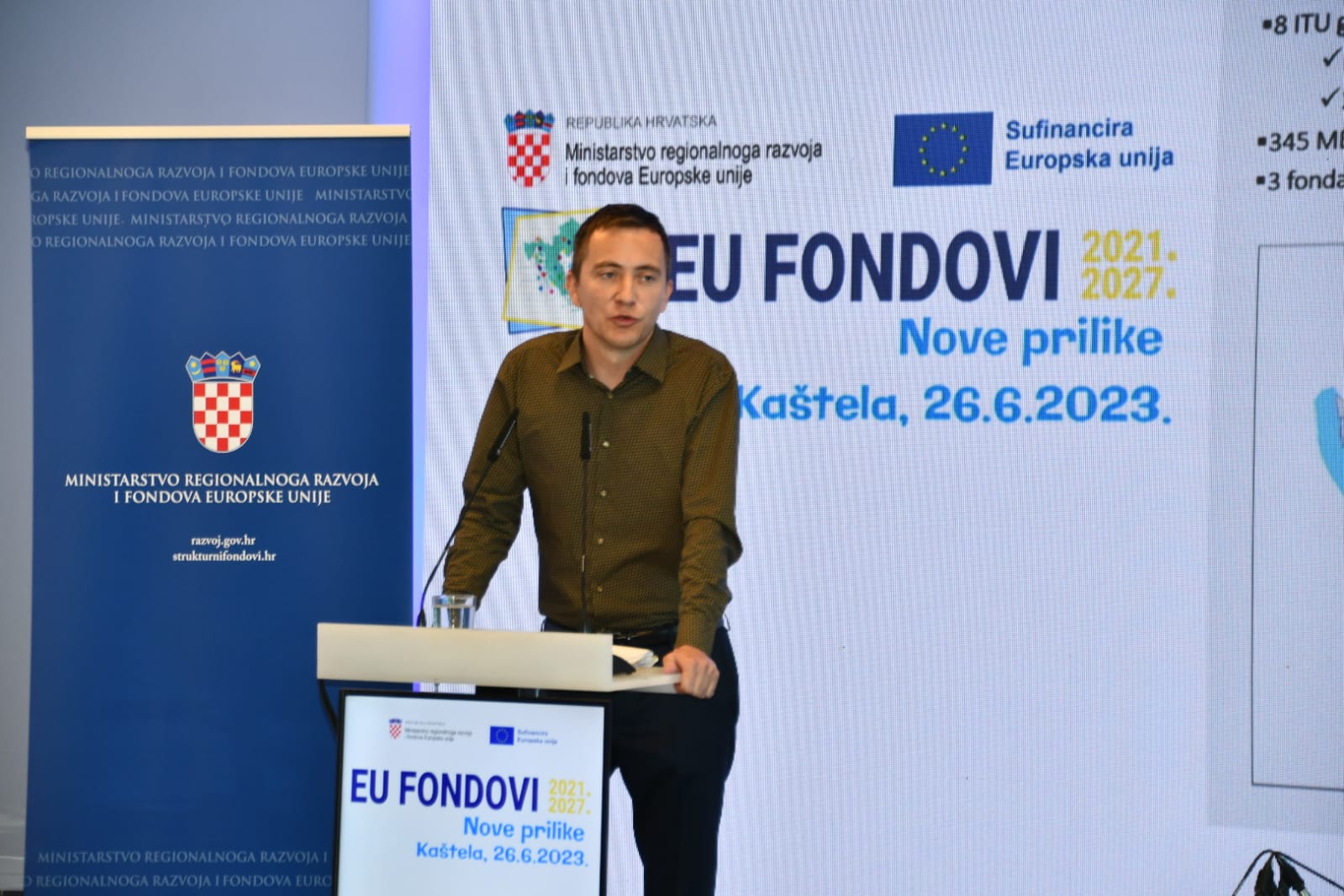 U organizaciji Ministarstva regionalnoga razvoja i fondova Europske unije u Kaštelama je danas organizirano deveto po redu informativno događanje „EU FONDOVI – Nove prilike 2021.-2027.“ u sklopu kojega su gospodarstvenicima te predstavnicima općina, gradova i županija s područja Dalmacije prezentirane mogućnosti EU sufinanciranja projekata u aktualnom financijskom razdoblju, u okviru novih programa Konkurentnost i kohezija 2021.-2027. i Integriranog teritorijalnog programa 2021.-2027.